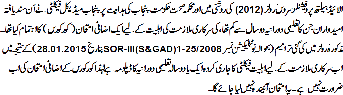 1 فیڈرل بورڈ آف انٹرمیڈیٹ اینڈ سیکنڈری ایجوکیشن ،اسلام آباد اور بورڈ آف انٹرمیڈیٹ اینڈ سیکنڈری ایجوکیشن، لاہور سے پاس شدہ طلبا جنہوں نے ایف۔ایس۔ سی الائیڈ ہیلتھ سائنسز میں پاس کی ہوئی ہے، انہیں پنجاب میڈیکل فیکلٹی کی نیو سکیم آف سٹڈیز کے مطابق متعلقہ کورس میں مساوی تسلیم کیا جائے گا۔
