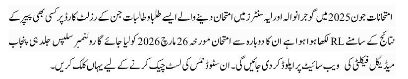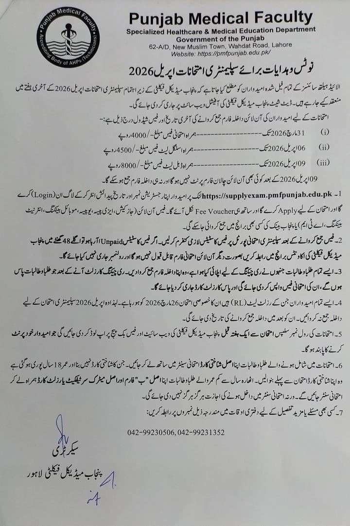 تمام طلبا و طالبات کو مطلع کیا جاتا ہے کہ سیشن 2024-2026 کے فرسٹ ائیر سالانہ امتحانات، 2023-2025 کے سیکنڈ ائیر سالانہ امتحانات اور جون 2025 کے امتحانات میں فیل شدہ سٹوڈنٹس کے سپلیمنٹری امتحانات اپریل 2026 کے آخری ہفتہ میں لیے جائیں گے۔ سپلیمنٹری امتحانات کا اشتہار جلد اخبارات اور پی ایم ایف کی ویب سائیٹ پر دے دیا جائے گا جس میں آن لائن داخلہ فارم جمع کروانے کا شیڈول اور طریقہ کار موجود ہو گا۔